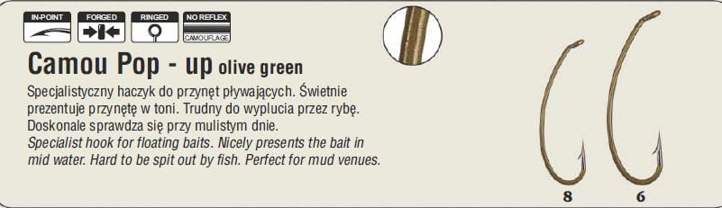 Traper Hikara Camou Green Pop-Up Nr 6 to wytrzymały haczyk karpiowy, stworzony specjalnie do przynęt pływających. Doskonale prezentuje przynętę w toni i jest trudny do wyplucia przez rybę, co zwiększa skuteczność połowu.