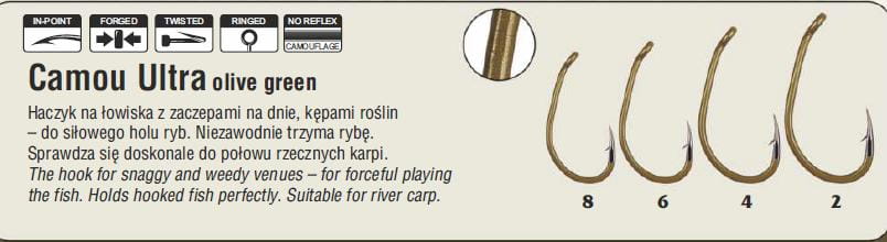Traper Hikara Camou Green Ultra Nr 8 to wyjątkowo wytrzymały haczyk karpiowy, idealny do połowu na łowiskach z zaczepami, kępami roślin i trudnym dnem. Zapewnia pewne utrzymanie ryby podczas siłowego holu, szczególnie sprawdzając się przy połowie rzecznych karpi.