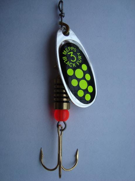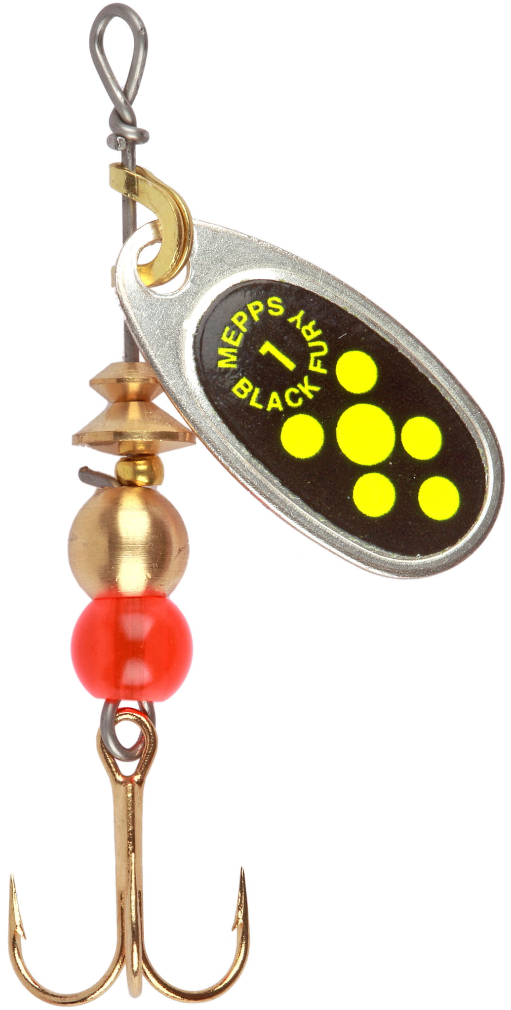Błystki obrotowe serii Mepps Black Fury to niezwykle skuteczna przynęta spinningowa. Do jej cech charakterystycznych należą paletka typu Comet (nieco węższa od skrzydełka typu Aglia), cylindryczny korpus z czerwonym koralikiem raz złota kotwiczka.