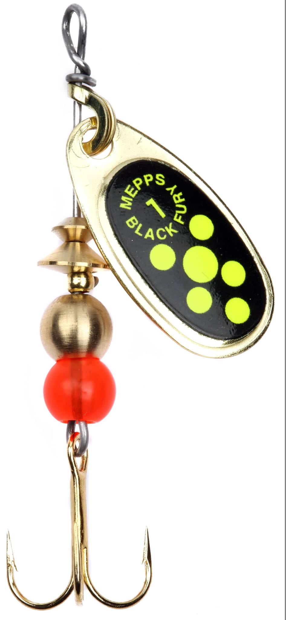 Błystki obrotowe serii Mepps Black Fury to niezwykle skuteczna przynęta spinningowa. Do jej cech charakterystycznych należą paletka typu Comet (nieco węższa od skrzydełka typu Aglia), cylindryczny korpus z czerwonym koralikiem raz złota kotwiczka.