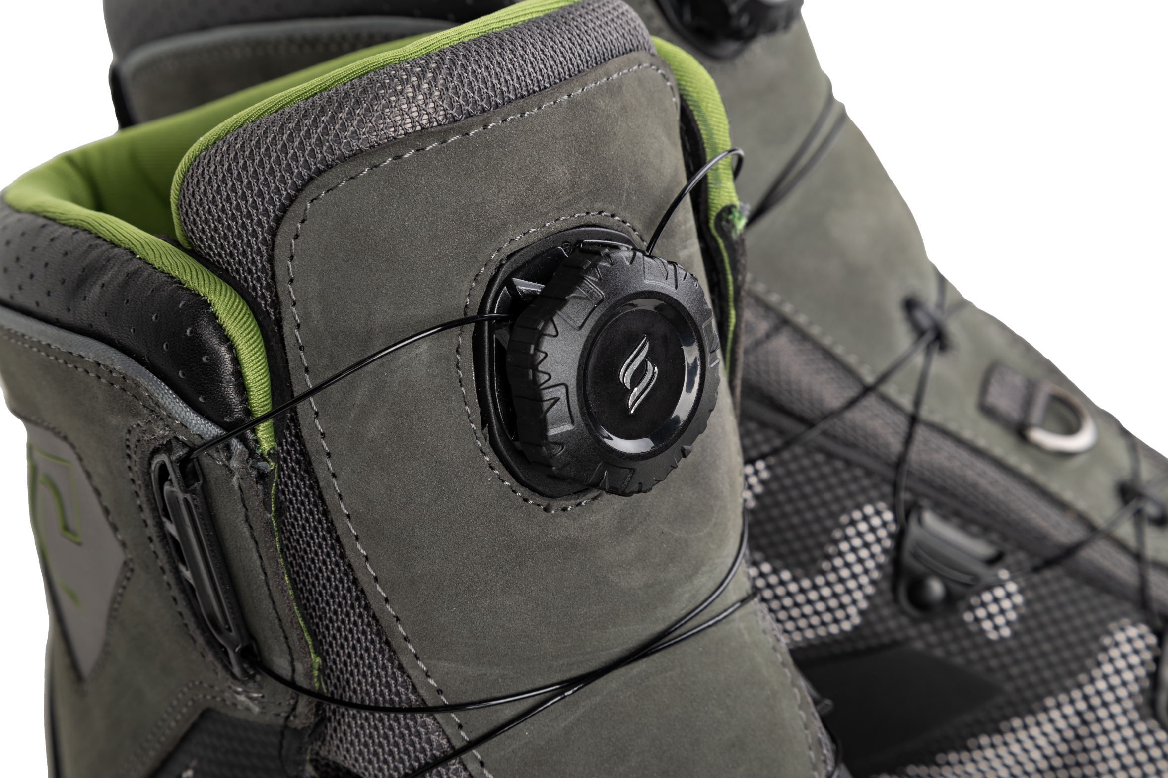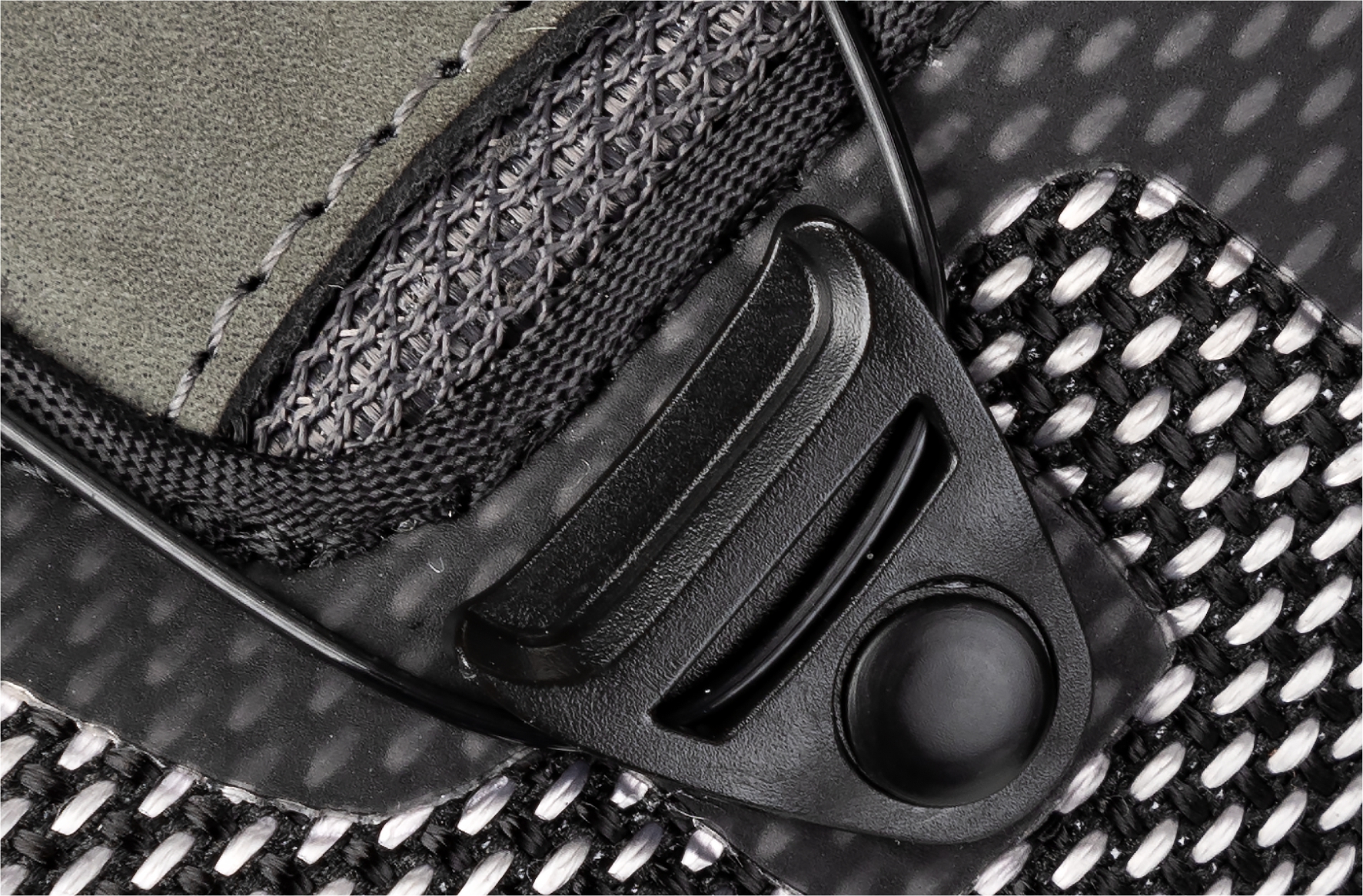 Zastosowany system zapięcia ATS pozwala na szybkie i niezwykle precyzyjne dopasowanie buta do stopy. Regulacja odbywa się za pomocą solidnego pokrętła oporowego, a powlekana linka ze stali nierdzewnej płynnie przesuwa się przez trwałe, gładkie przelotki. Poluzowanie systemu jest szybkie i intuicyjne – wystarczy odciągnąć pokrętło. Język buta został obszyty odpornym na przetarcia nubukiem, co zwiększa trwałość całego mechanizmu.