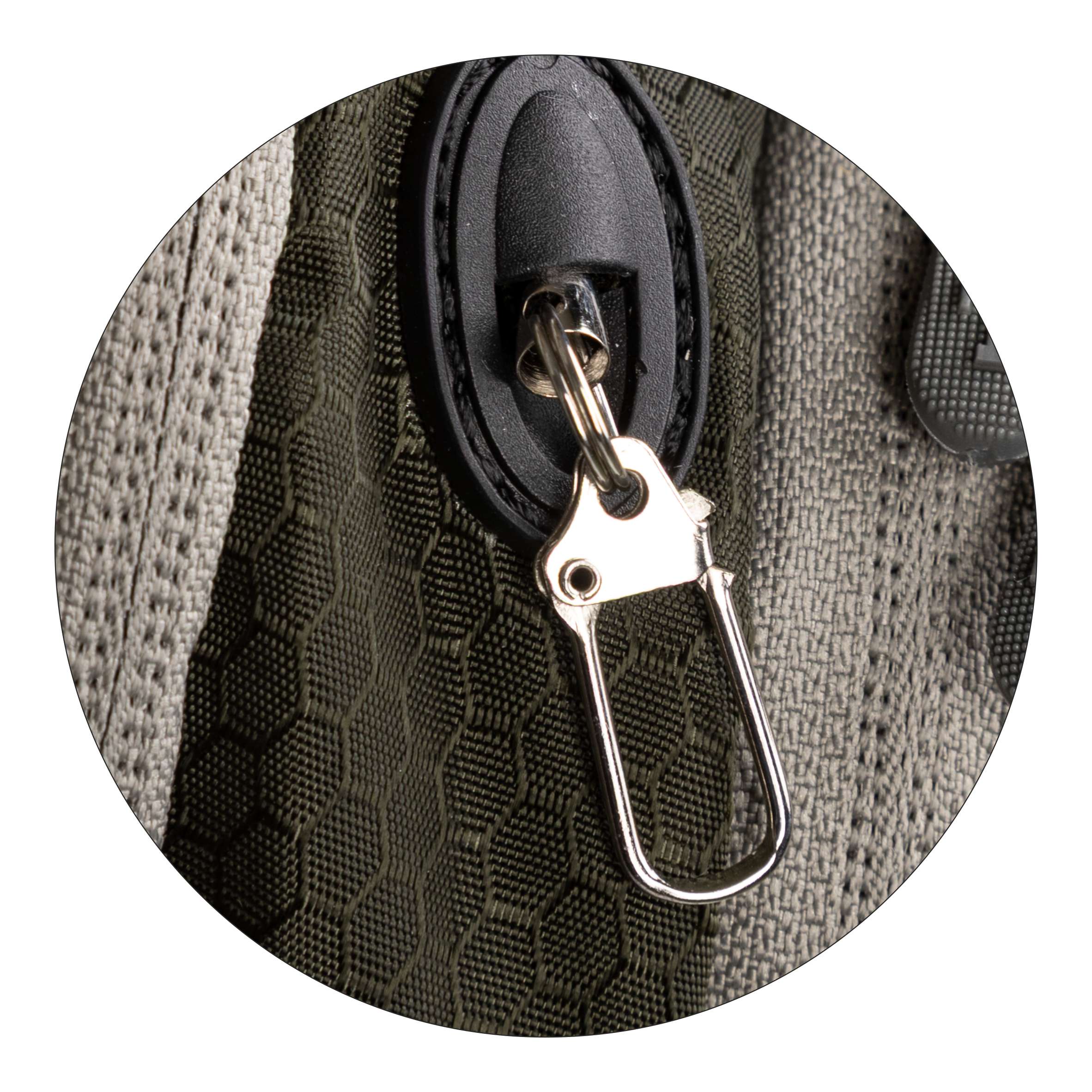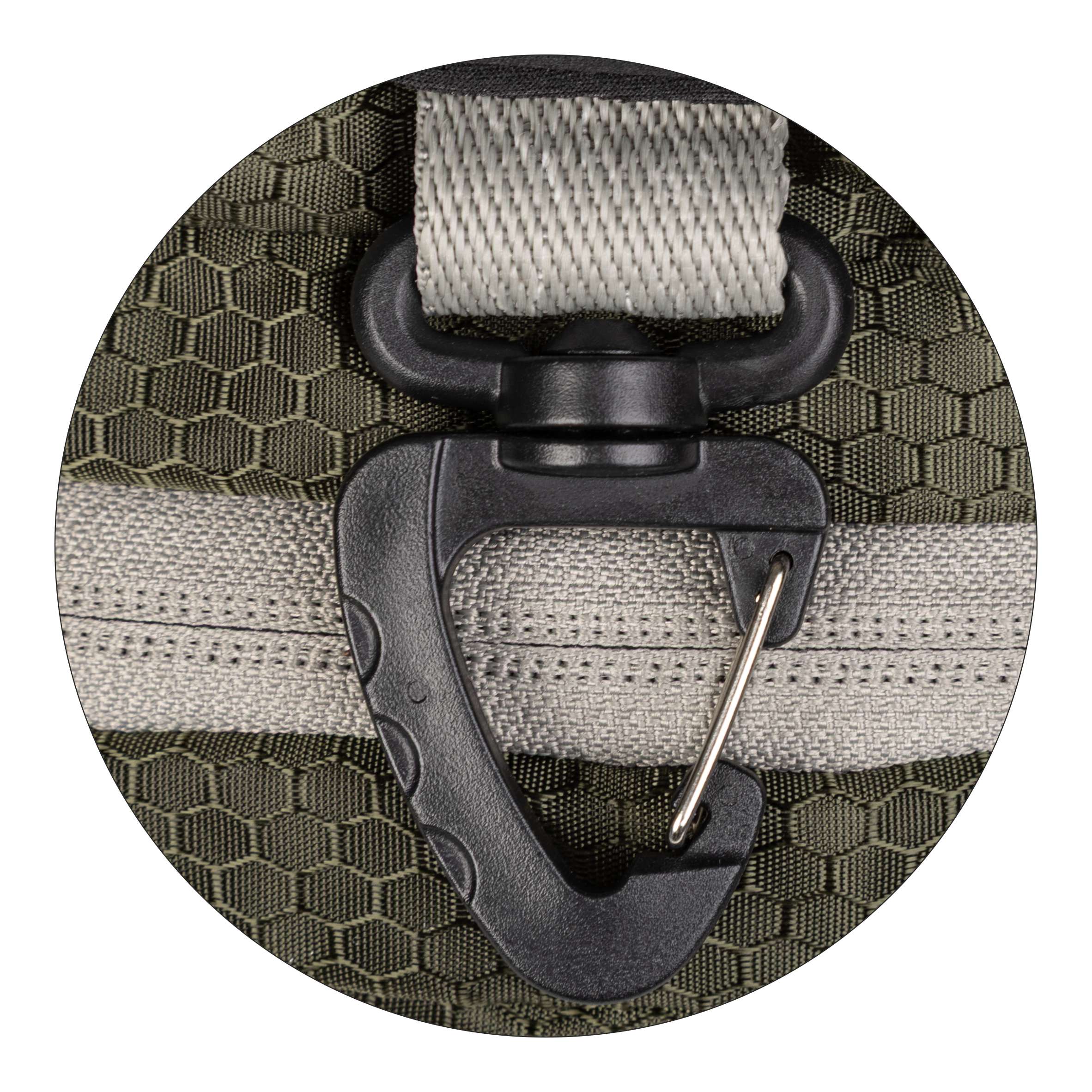 Nad plecakiem umieszczono praktyczny karabińczyk, idealny do zawieszenia podbieraka. Przednia torba oferuje dwie zamykane przegrody na akcesoria oraz jedną otwartą, zapewniając szybki dostęp do najczęściej używanego sprzętu. Na jej górze znajdują się dwa sprężynowe zingery, umożliwiające bezpieczne i wygodne mocowanie szczypiec oraz obcinaczki.