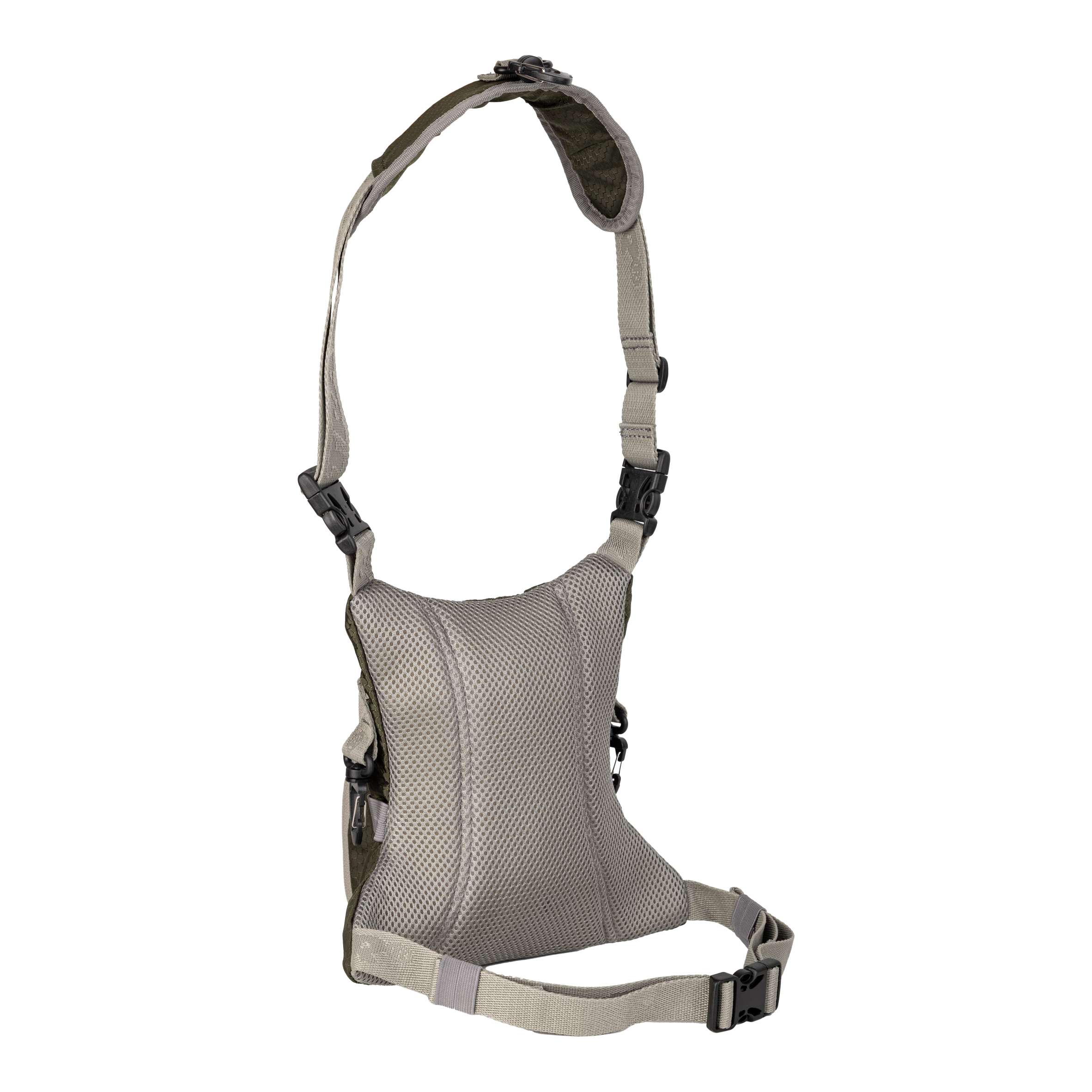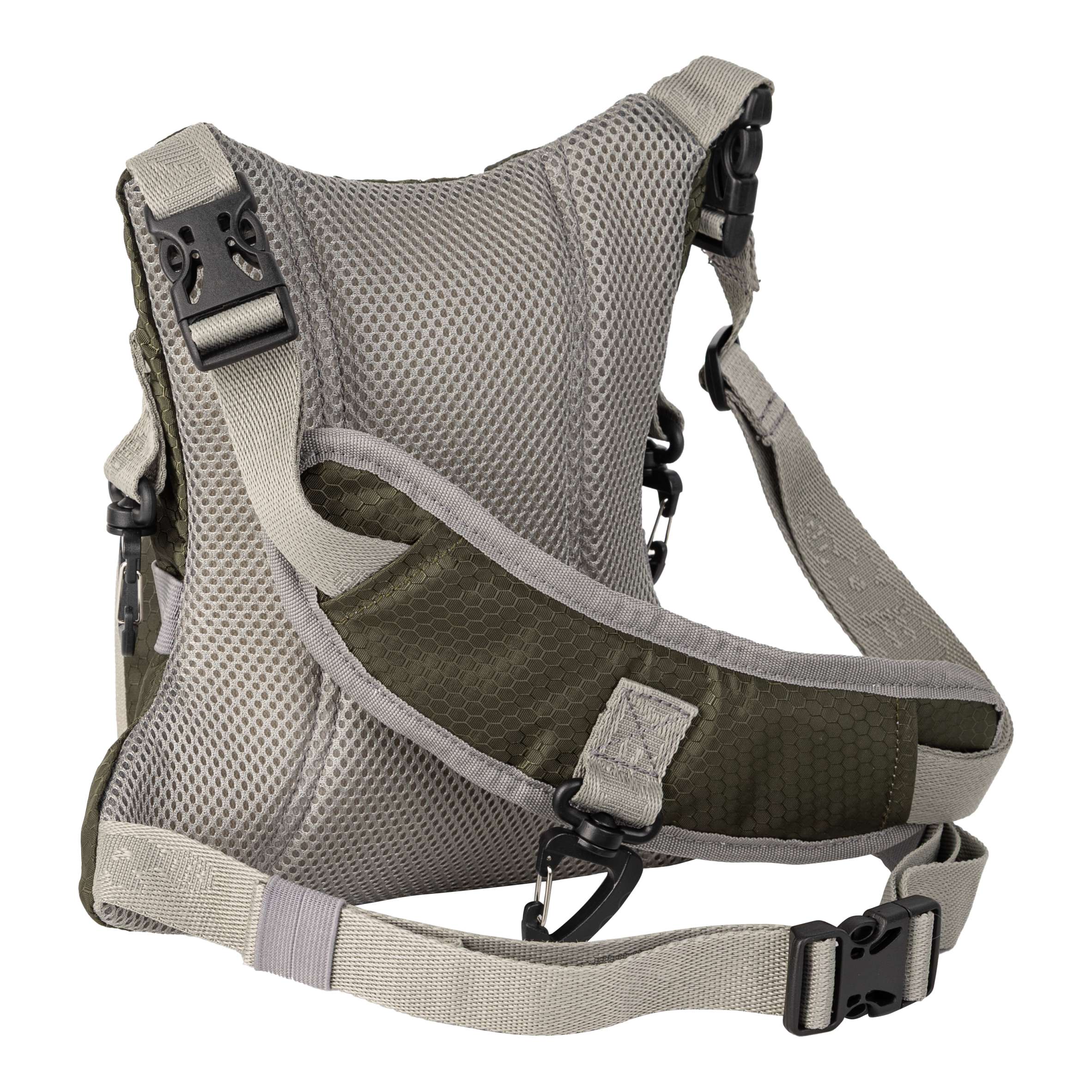 Przednia kieszeń z dużą patką pozwala na przechowywanie i szybki dostęp do przynęt, a patka nad kieszenią umożliwia przenoszenie oraz suszenie much. Po bokach znajdują się karabińczyki, a w pasie na szyję praktyczny zaczep do podbieraka, co zwiększa funkcjonalność podczas wędkowania.