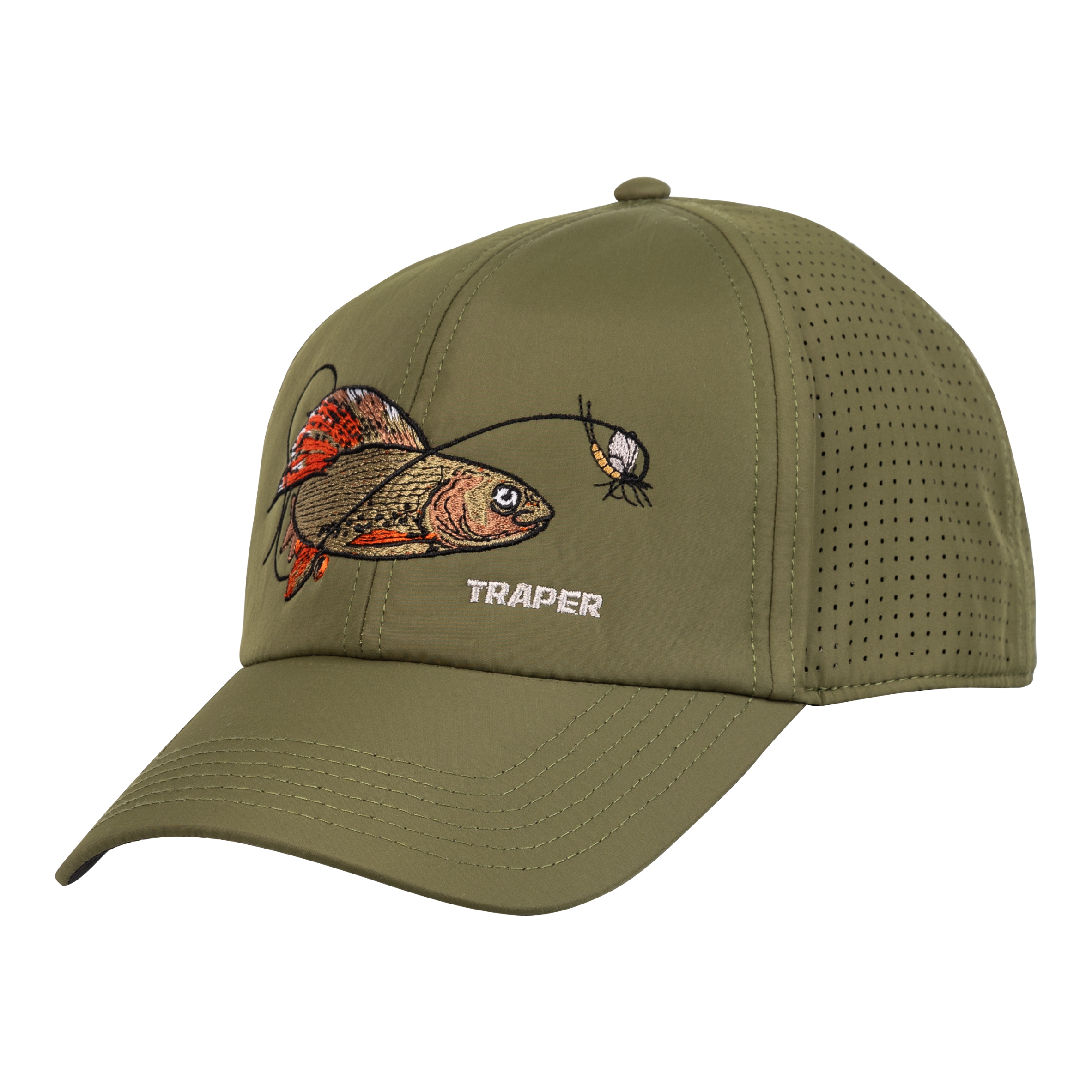 Laserowo wycięte otwory cyrkulacyjne gwarantują optymalną wentylację, a czarny spód daszka skutecznie redukuje odbicia światła od lustra wody. Regulacja na rzep pozwala na idealne dopasowanie, a haftowane motywy ryb nadają czapce wyjątkowy, wędkarski charakter.