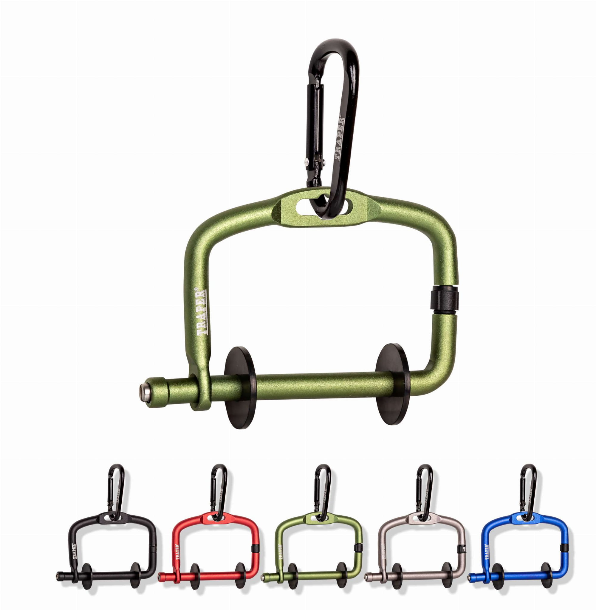 Stabilne pierścienie utrzymują szpule w jednym miejscu, a karabińczyk pozwala na szybkie przypięcie dyspensera do odzieży wędkarskiej.
