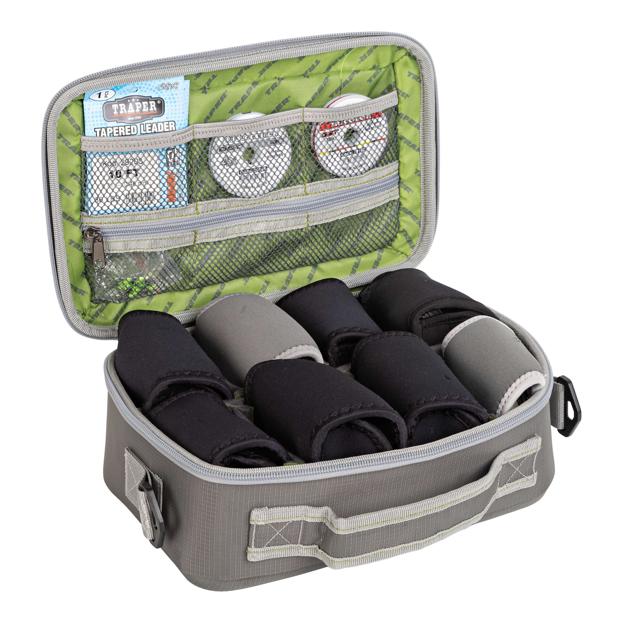 Na pokrywie umieszczono potrójną kieszeń z elastycznej siatki, idealną do przechowywania linek, podkładów, przyponów lub drobnych akcesoriów. Etui można wygodnie przenosić za pomocą parcianej rączki lub regulowanego pasa naramiennego, co zapewnia komfort użytkowania w każdych warunkach.