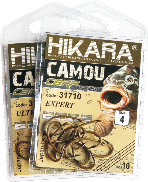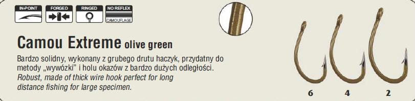 Seria haczyków Camou została wykonana z myślą całkowitego kamuflażu. Haczyki Camou pokrywa bardzo wysokiej jakości trwała powłoka galwaniczna. Jej porowata powierzchnia idealnie eliminuje refleksy świetlne i haczyk nie odstrasza ryb z pola nęcenia. Dzięki takiej powłoce, wykonane na trzonie haka zestawy z ringiem czy klasycznym włosem, utrzymują się bardzo solidnie w miejscu wiązania.
