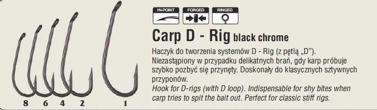 Haczyki do tworzenia systemów D-Rig (z pętlą "D") niezastąpiony w przypadku delikatnych brań, gdy karp próbuje szybko pozbyć się przynęty. Doskonały do klasycznych sztywnych przyponów.