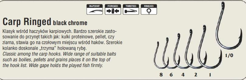 Klasyczny wśród haczyków karpiowych. Bardzo szerokie zastosowanie do przynęt tj. kulki proteinowe. pellet, czy ziarna stawi go na czołowym miejscu wśród haków. Szerokie kolonko doskonale "trzyma" holowaną rybę.