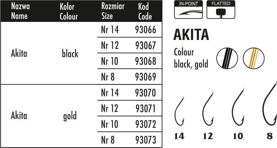 Model Akita posiada smukłą konstrukcję i cienki, chemicznie ostrzony grot, który umożliwia błyskawiczne zacięcie nawet przy bardzo delikatnych braniach. Dzięki temu haczyk doskonale sprawdza się przy połowie na małe przynęty – zwłaszcza białe robaki, ochotkę, pinkę oraz delikatne przynęty roślinne.
