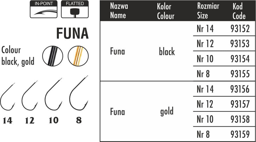 Model Funa został zaprojektowany z myślą o skutecznym łowieniu ryb spokojnego żeru. Jego lekko zaokrąglony łuk kolankowy zapewnia naturalną prezentację przynęty, a grot typu In-Point – ostry i zakrzywiony – gwarantuje szybkie i pewne zacięcie.