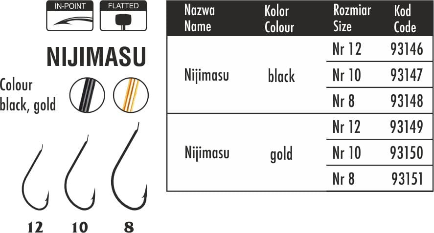 Haczyki Traper Specialist – Nijimasu Nr 8 Gold to solidne i uniwersalne haczyki o klasycznym kształcie, wyposażone w zakrzywione ostrze In-Point i spłaszczony trzonek (Flatted), które zapewniają pewne zacięcie i mocne wiązanie przyponu. Złote wykończenie haczyka zwiększa jego widoczność i atrakcyjność pod wodą, co może skutecznie przyciągać ryby, szczególnie w wodach o ograniczonej przejrzystości.