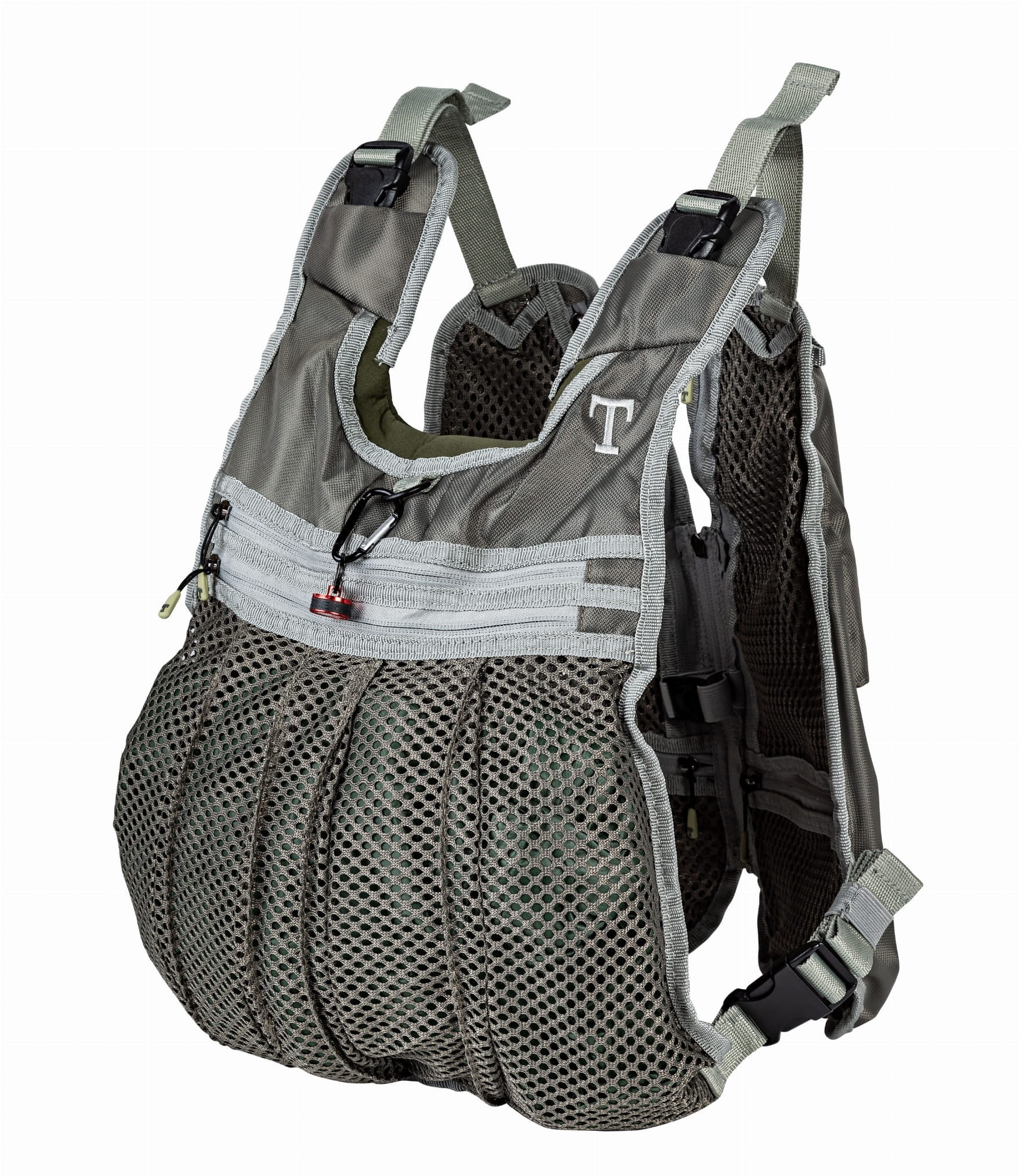 Chestpack mocowany jest do pleców za pomocą regulowanych i odpinanych pasów, a tylna część wykonana z siatki cyrkulacyjnej zapewnia wentylację i komfort podczas ciepłych dni. Dodatkowo z tyłu znajdują się zaczep do podbieraka oraz dwie kieszenie na drobne akcesoria.