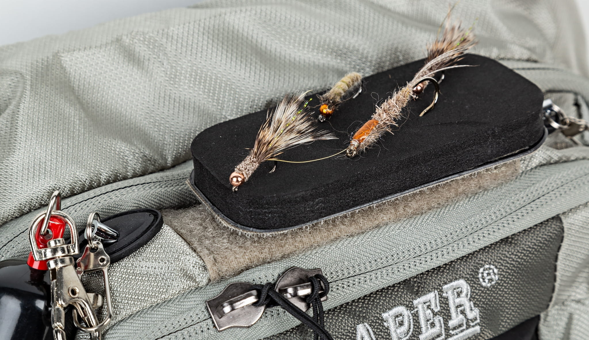 Przedni chestpack posiada dwie oddzielne komory z kieszeniami wewnętrznymi, pozwalające wygodnie segregować drobny sprzęt. W górnej części znajdują się patka do przynęt oraz 2 wysuwane zaczepy na szczypce i obcinaczki, gwarantujące szybki dostęp bez ryzyka zgubienia narzędzi.