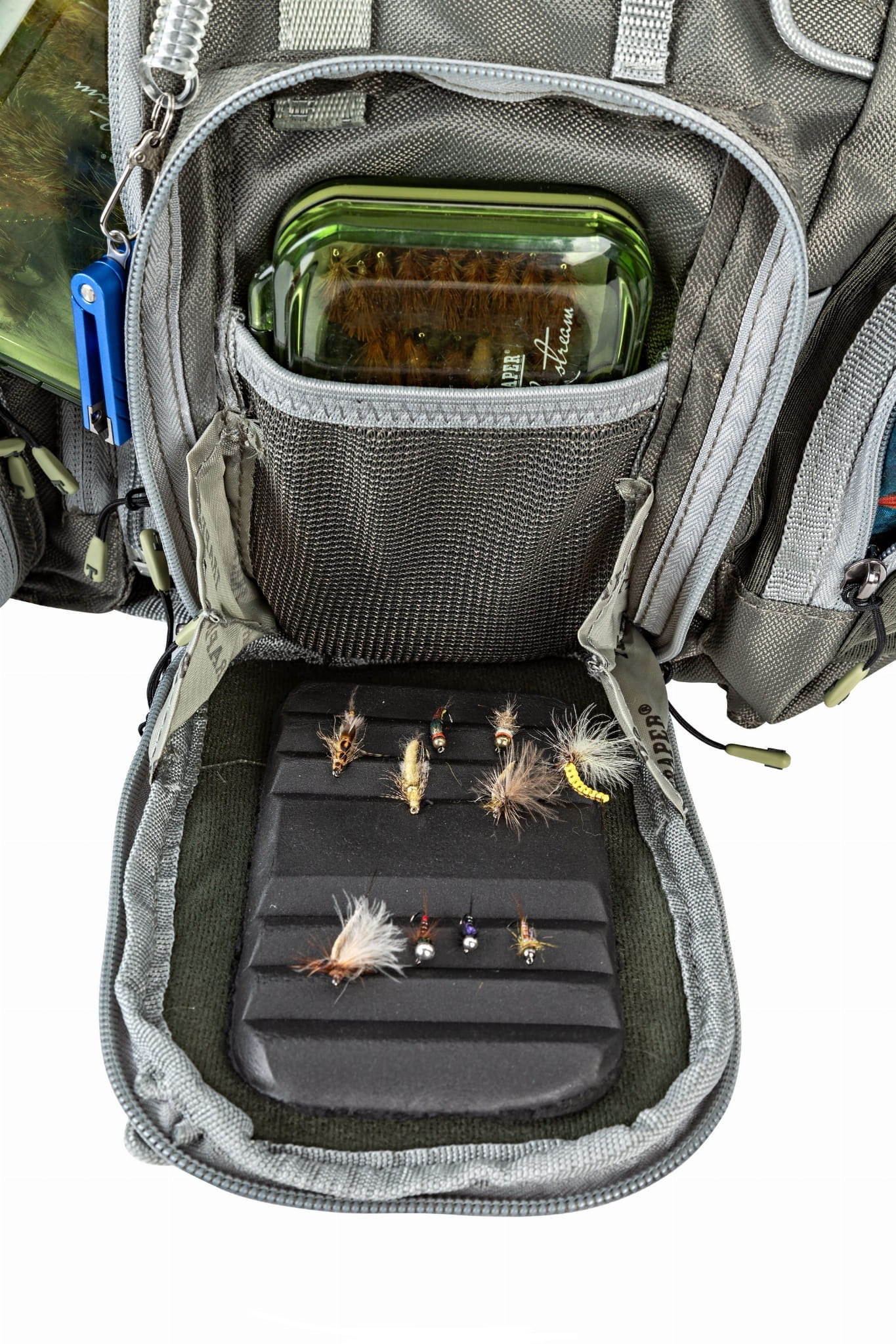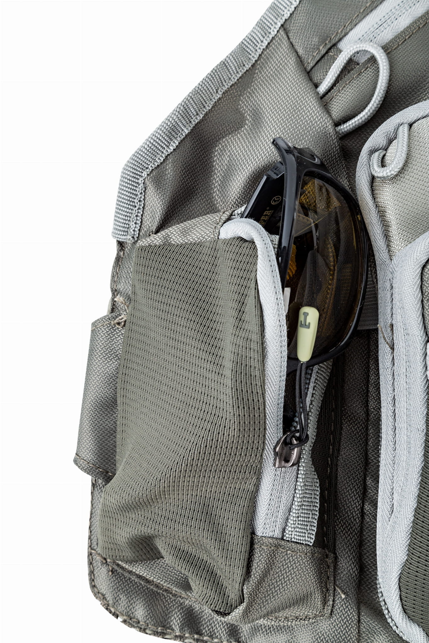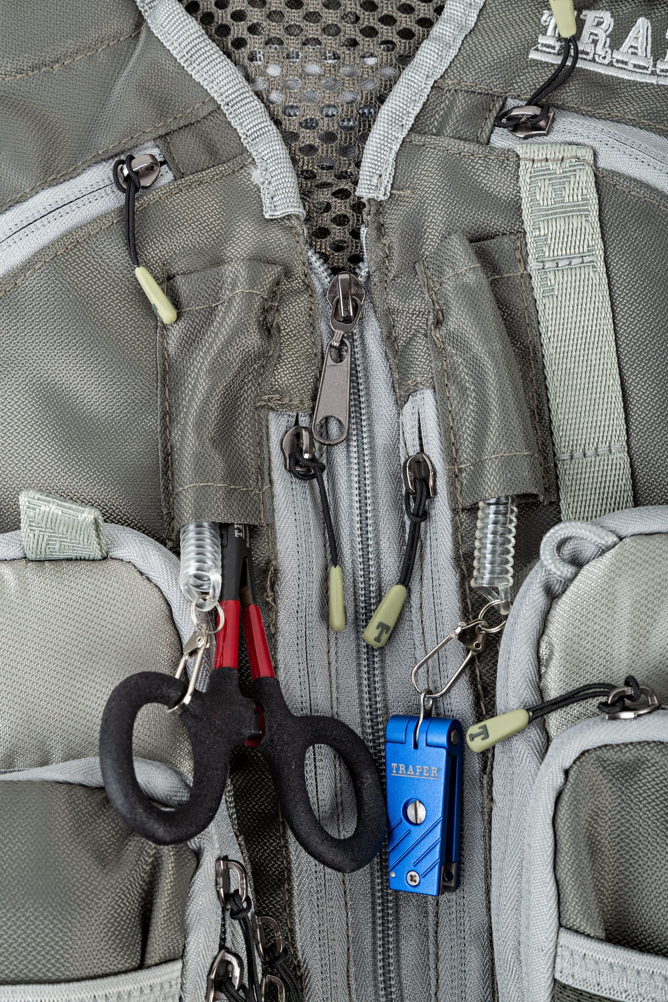 • Dodatki: kryte, sprężynowe zaczepy na obcinaczkę i szczypce; pętelki montażowe; rzepy do przenoszenia zapasowej wędki; zaczep do podbieraka