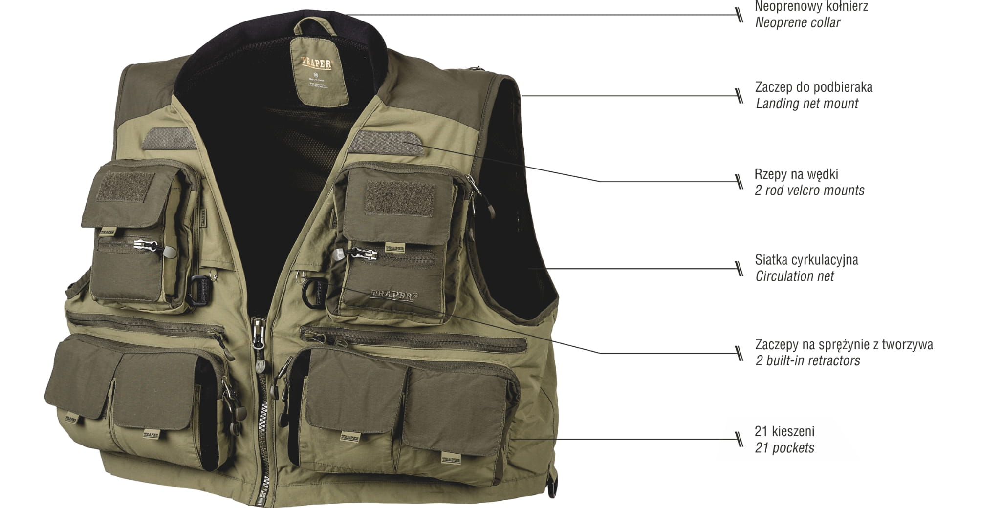 Model oferuje 21 praktycznych kieszeni, w tym dużą zasuwaną kieszeń na plecach, umożliwiającą wygodne przechowywanie sprzętu. Liczne uchwyty, napy i zaczepy pozwalają na szybki dostęp do podbieraka, wędek, przynęt oraz narzędzi.