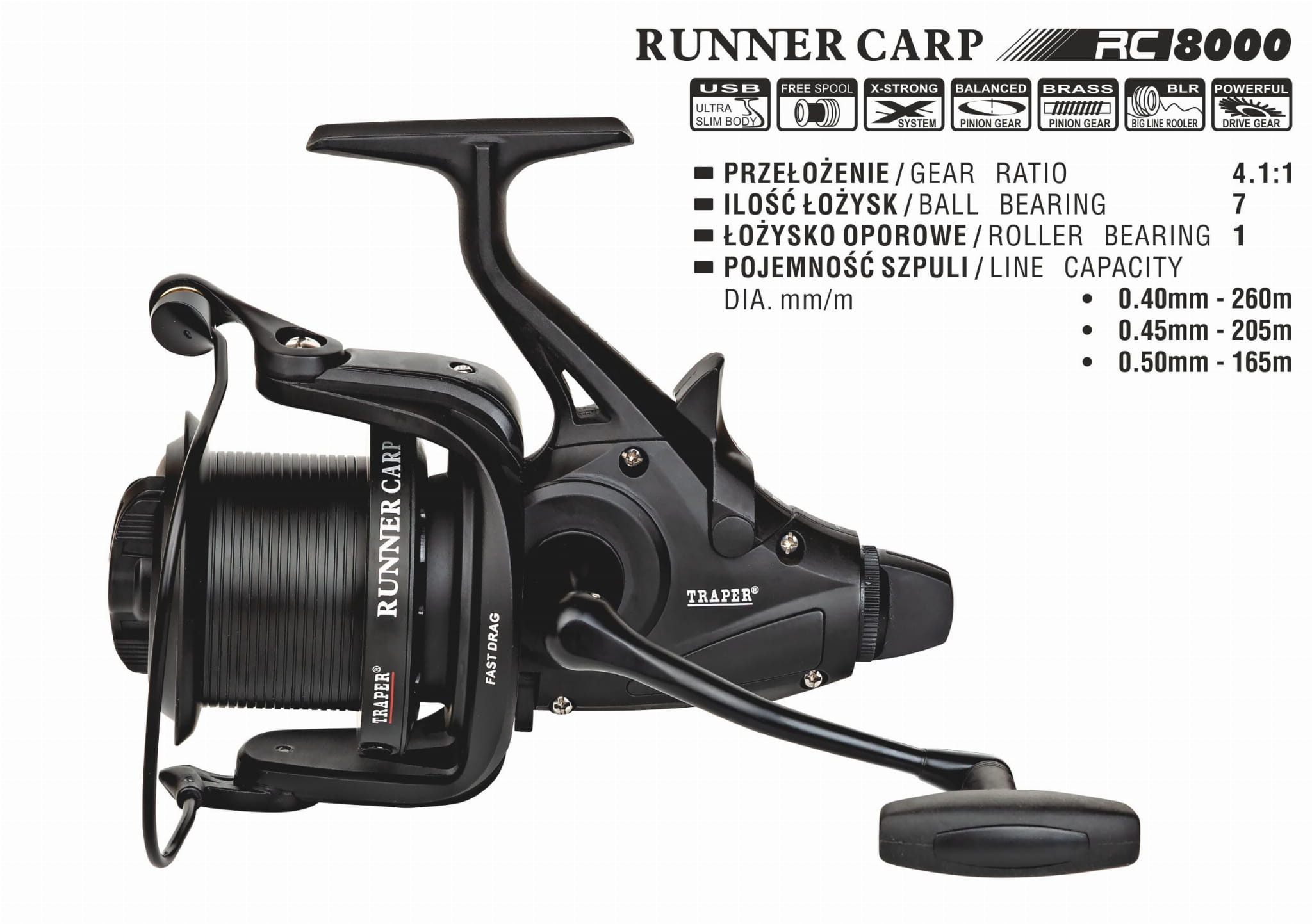 Traper Runner Carp 8000 to klasyczny kołowrotek karpiowy o charakterystycznej, smukłej linii "big", zaprojektowany z myślą o komfortowym połowie dużych karpi. Wyposażony w system wolnego biegu, umożliwia płynną regulację i pełną kontrolę nad zestawem podczas holu.