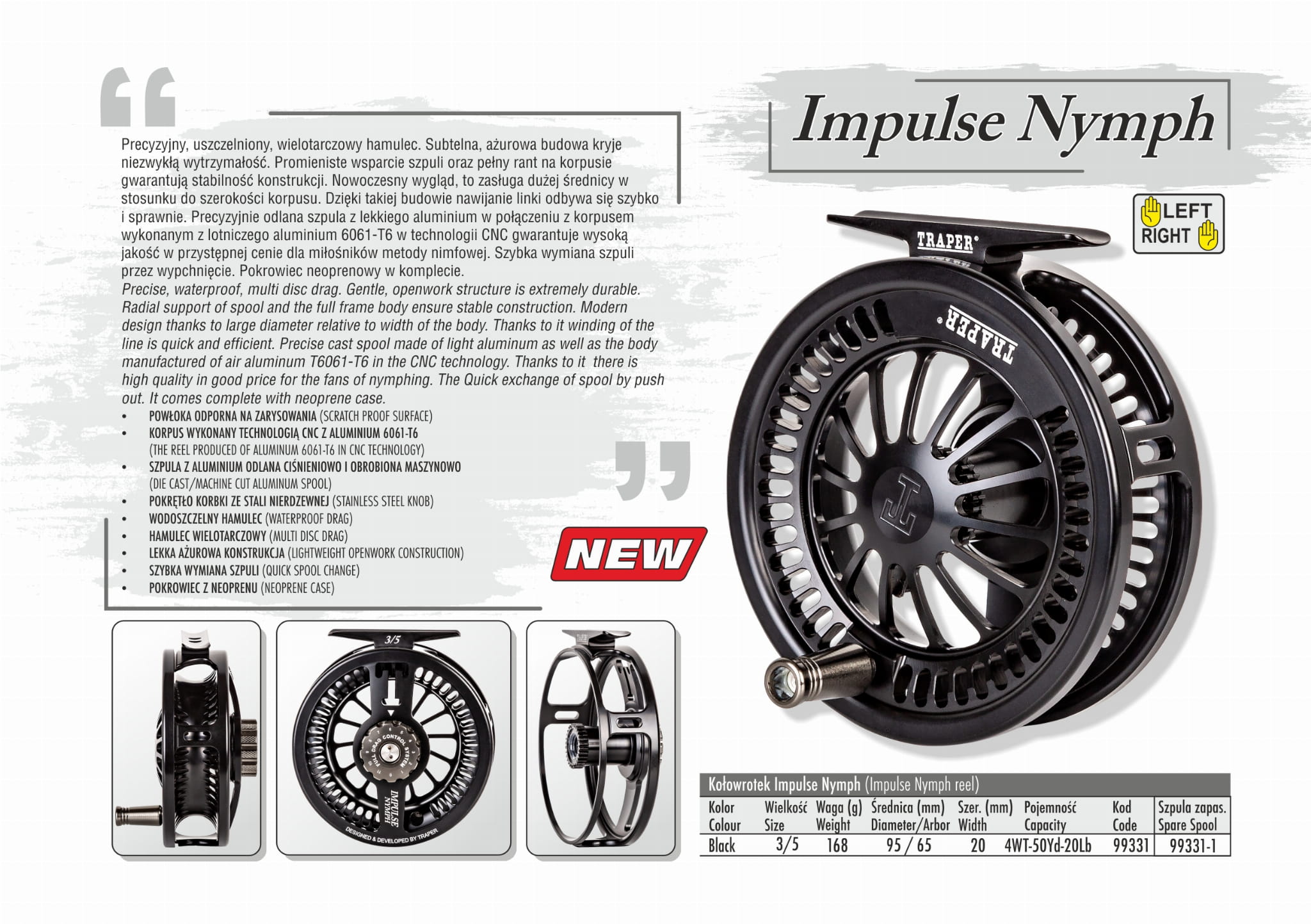 • Materiał szpuli: aluminium odlane ciśnieniowo i obrobione maszynowo