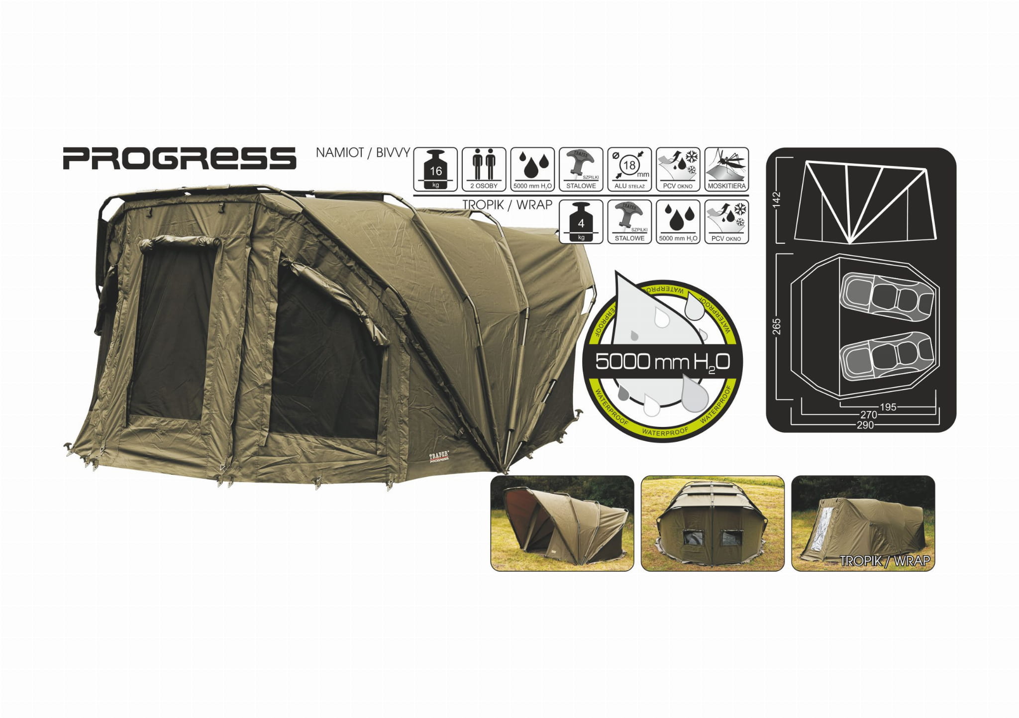 Namiot wędkarski PROGRESS Traper to solidna i funkcjonalna konstrukcja, stworzona z myślą o wędkarzach wymagających komfortu i niezawodnej ochrony podczas długich zasiadek.