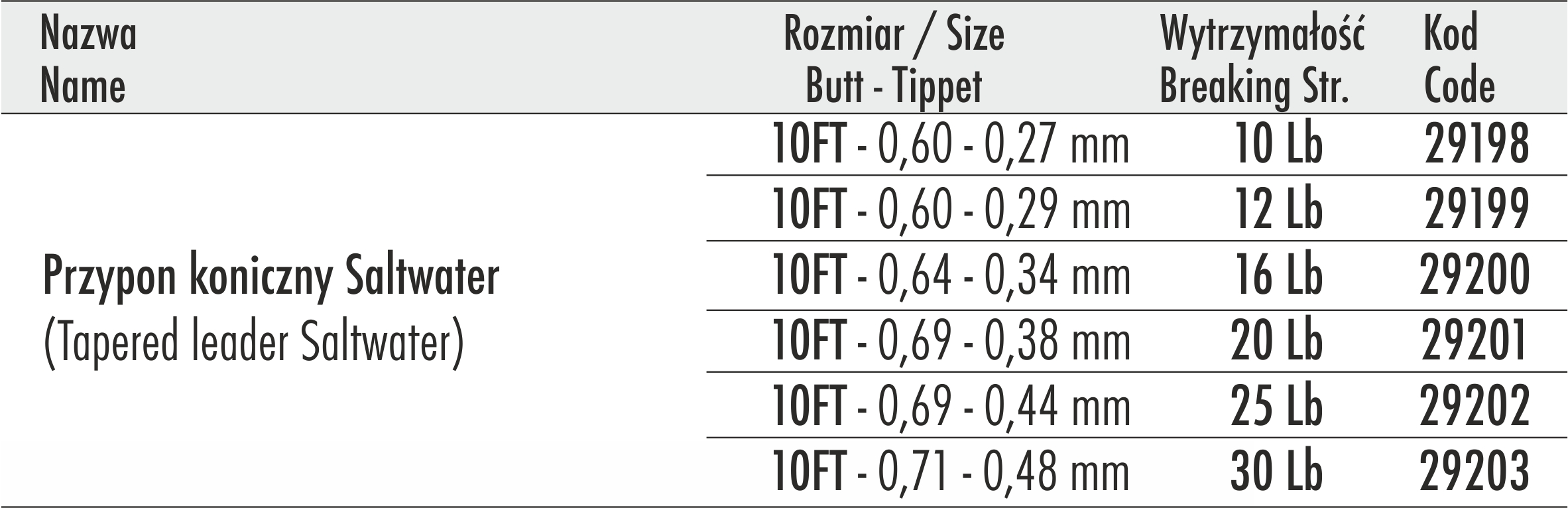 Traper Saltwater 10 ft – 12 lb to mocniejszy przypon koniczny, zapewniający doskonałą odporność na ścieranie i agresywne środowisko morskie. Równomierna elastyczność pozwala na naturalną prezentację przynęty oraz bezpieczny hol silnych ryb.