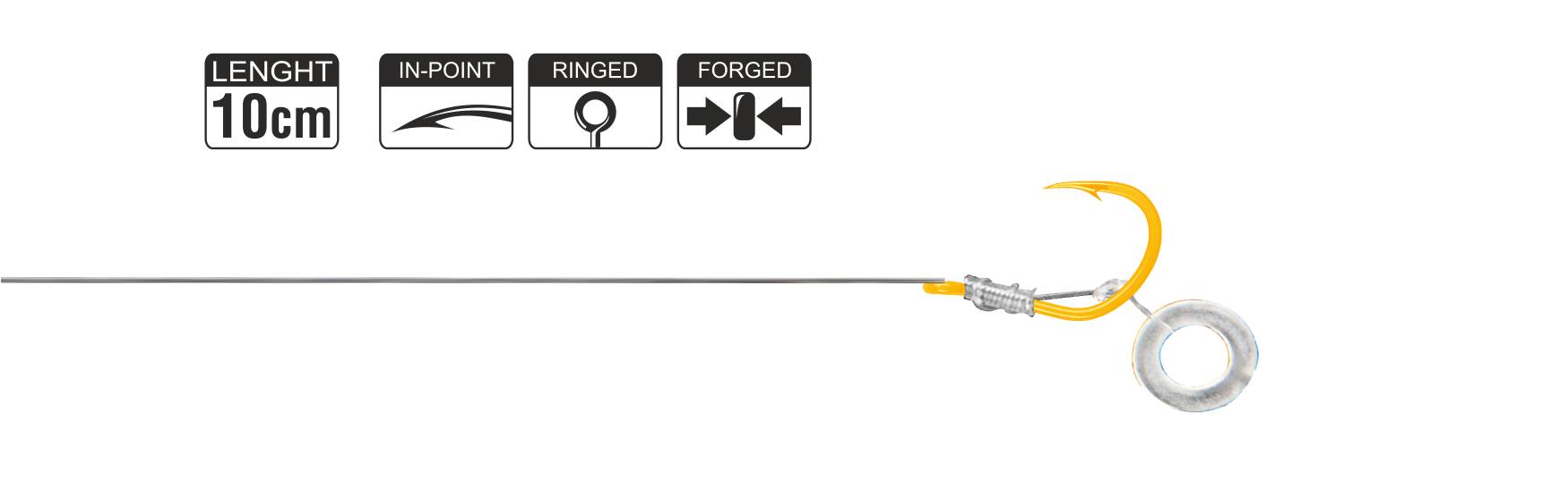 Wysokiej jakości żyłka o średnicy 0,24 mm i optymalna długość 10 cm gwarantują odpowiednią wytrzymałość i prezentację przynęty w podajniku. Haczyk posiada zadzior, ostrze In-Point, jest kuty (forged) i wyposażony w oczko (ringed). Złote wykończenie haczyka Gold poprawia widoczność pod wodą i może dodatkowo skłonić ryby do brania.