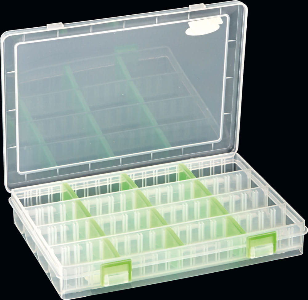 Pudełka na przynęty i drobne akcesoria. Tworzywo, z którego wykonane są pojemniki, nie ulega rozpuszczeniu przez twistery i rippery silikonowe.