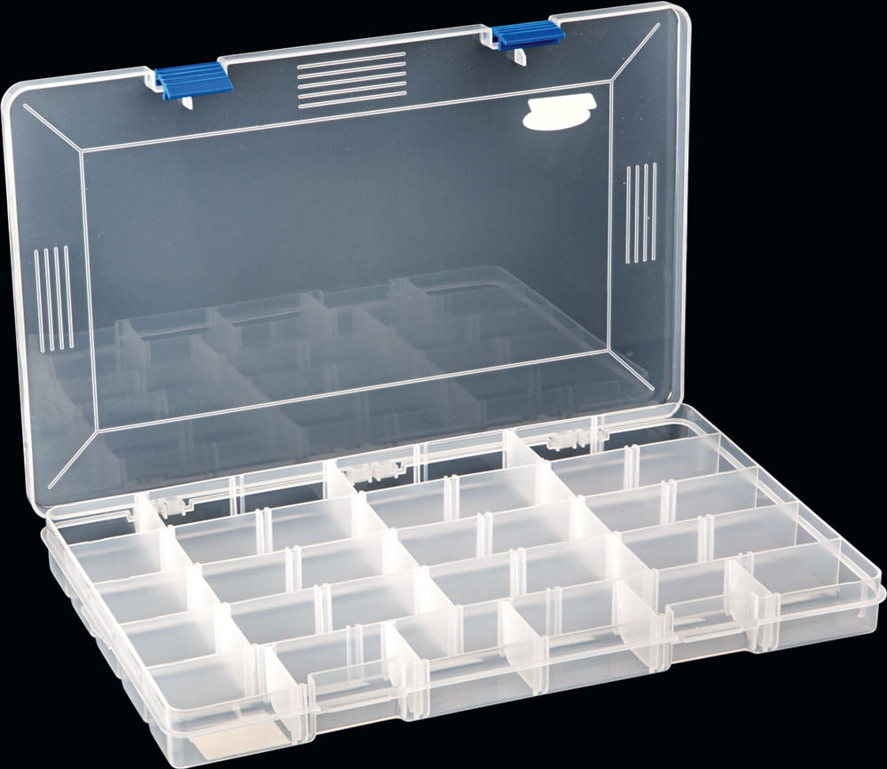 Pudełka na przynęty i drobne akcesoria. Tworzywo, z którego wykonane są pojemniki, nie ulega rozpuszczeniu przez twistery i rippery silikonowe.