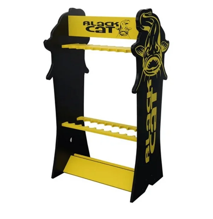 Stylowy stojak drewniany wędkarski z logo Black Cat, który zachwyca swoim eleganckim wykonaniem, doskonale nadaje się do ekspozycji i przechowywania wędek.