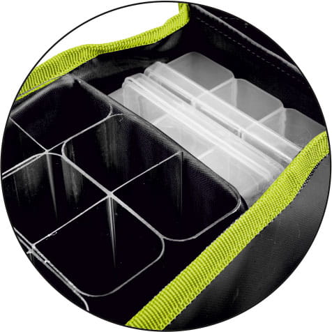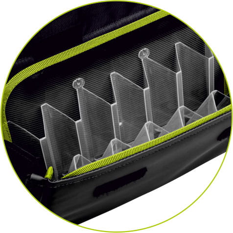 • Kieszenie na pilkery – torba wyposażona jest w dwie kieszenie z dwunastoma przegrodami, które pozwalają na porządkowanie pilkerów, a także 18 dodatkowych przegród w głównej komorze torby, zapewniając odpowiednią organizację i łatwy dostęp do sprzętu.