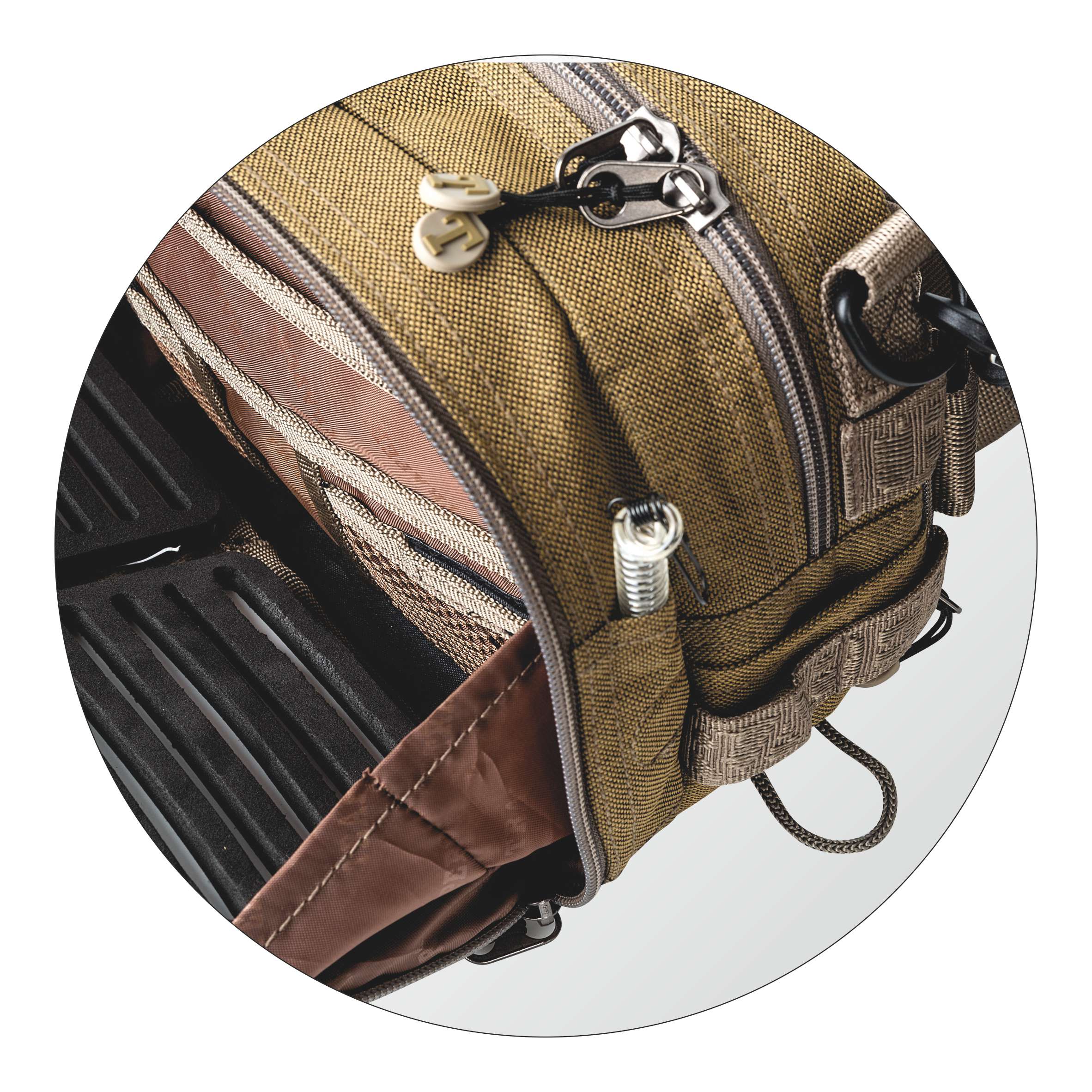 Seria Fly Stream wyróżnia się przemyślanym rozmieszczeniem przegród i kieszeni, zapewniając pełną organizację sprzętu wędkarskiego podczas wędkowania.