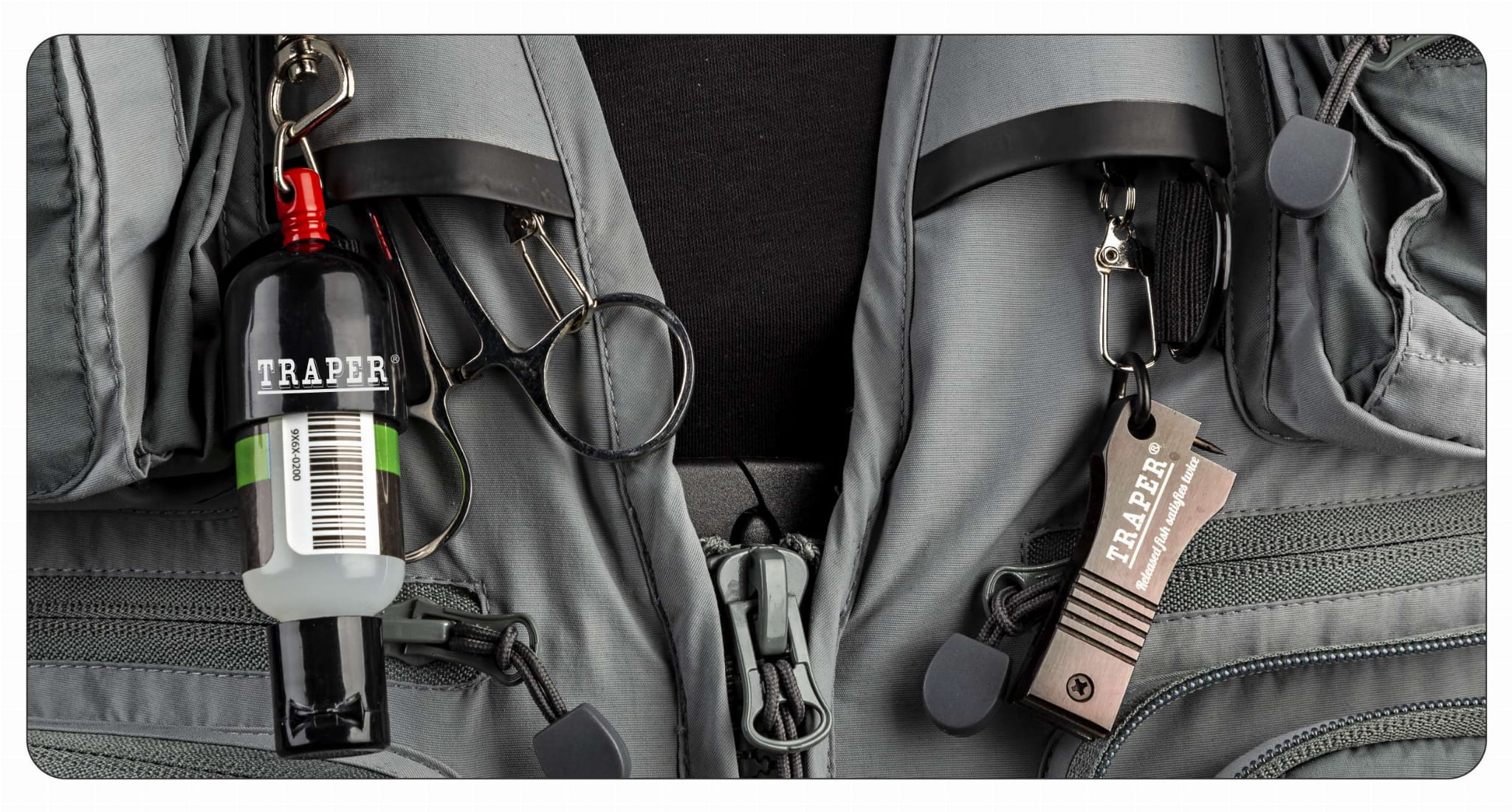 Uchwyt do płynów z zaczepem Traper wyposażony został w silikonowy zaczep, umożliwiający wygodne i stabilne mocowanie butelek z żelami, smarami i innymi płynami. Wbudowana agrafka pozwala na szybkie przypięcie uchwytu do odzieży, kamizelki lub torby wędkarskiej.