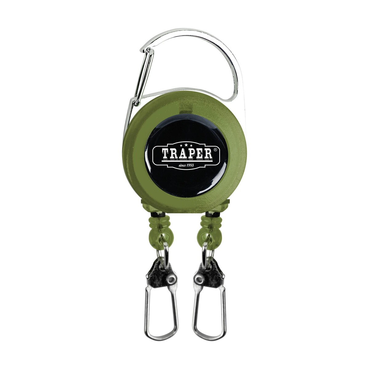 Uchwyt podwójny Traper w kolorze zielonym posiada dwie agrafki i rozwijaną, sprężynującą linkę, co umożliwia wygodne korzystanie z przypiętych elementów bez konieczności ich odpinania.