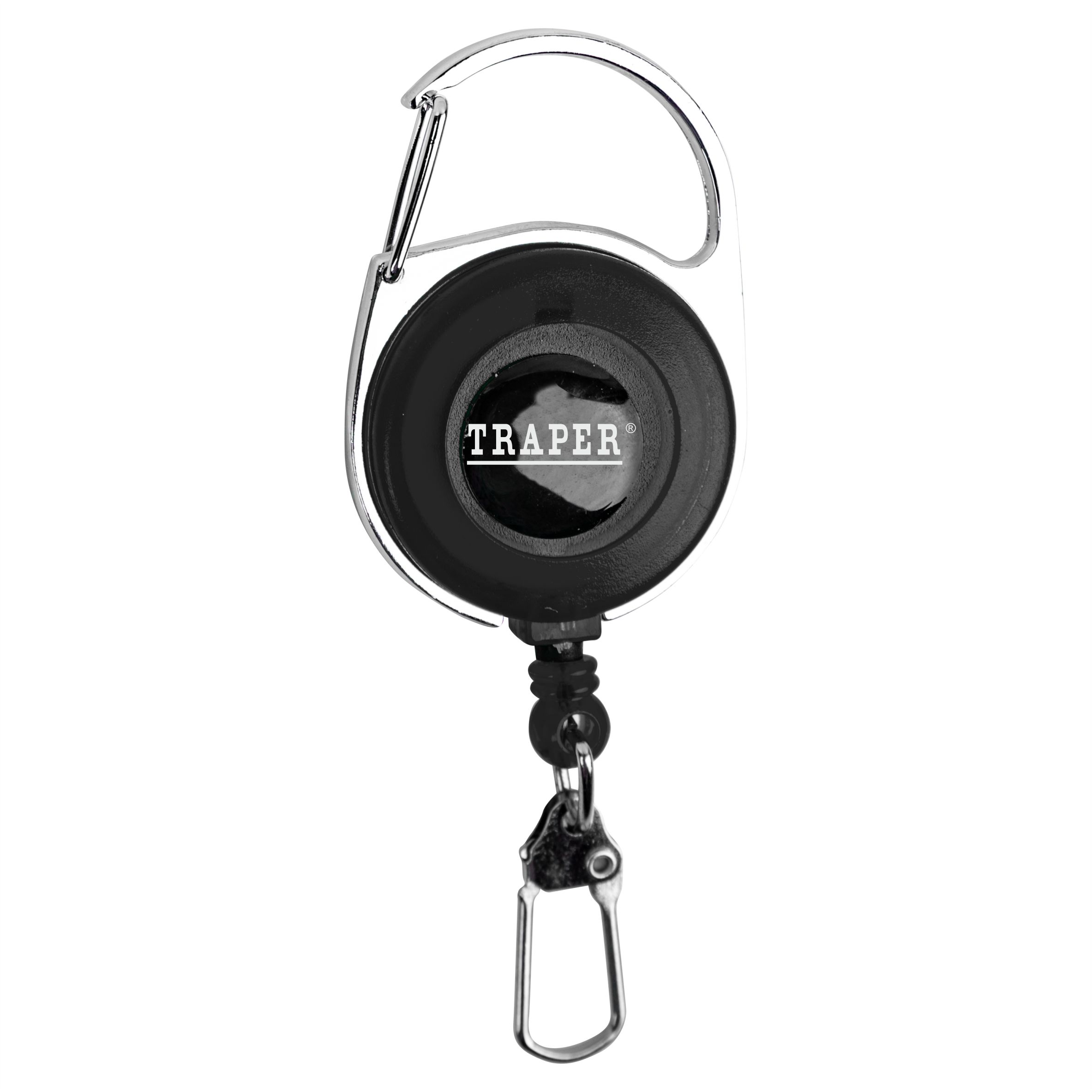 Czarny uchwyt pojedynczy Traper posiada karabińczyk i pojedynczą agrafkę na sprężynującej, wysuwanej linki, umożliwiając wygodne korzystanie z przypiętych przedmiotów. Można go zamocować do odzieży, kamizelki lub torby wędkarskiej.
