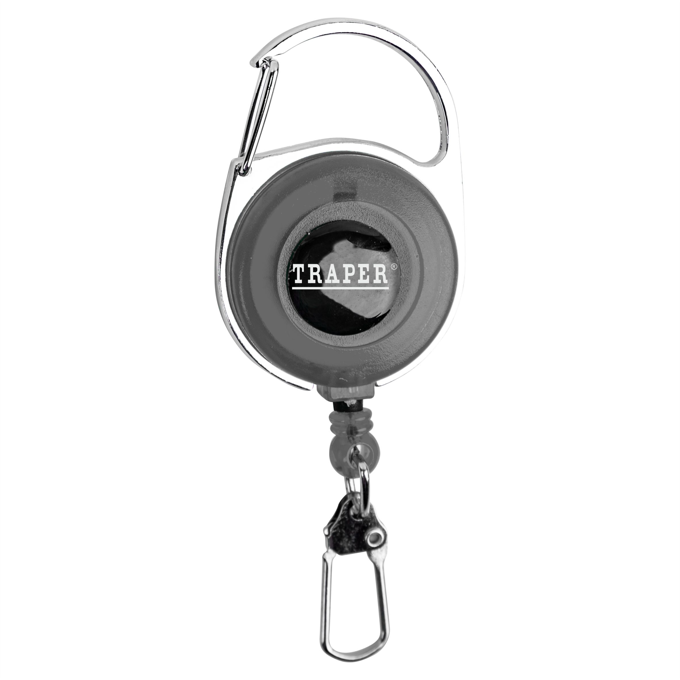 Szary uchwyt pojedynczy Traper wyposażony w karabińczyk i pojedynczą agrafkę na sprężynującej, wysuwanej linki pozwala na szybki dostęp do przypiętych przedmiotów. Można go przymocować do odzieży, kamizelki lub torby wędkarskiej.