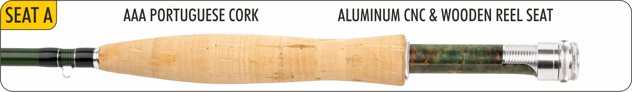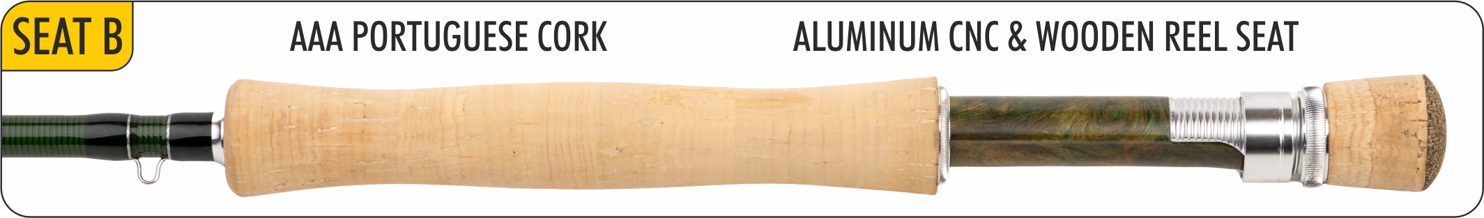 Rękojeść z portugalskiego korka klasy AAA zapewnia trwałość i komfort chwytu, a uchwyt kołowrotka z lotniczego aluminium CNC z insertem z drewna egzotycznego podkreśla elegancki, ponadczasowy styl tego modelu.