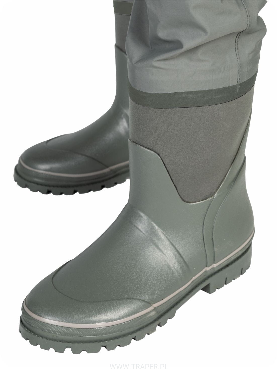 Do nogawek przymocowane jest obuwie wypełnione miękkim, 4-milimetrowym neoprenem, które zapewnia ciepło i wygodę podczas wędkowania. Profilowana, twarda podeszwa z antypoślizgowej gumy gwarantuje przyczepność na żwirowym, piaszczystym, grząskim i pochyłym podłożu. Specjalny bieżnik zwiększa stabilność i bezpieczeństwo w trudnym terenie.